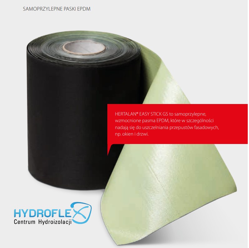 HERTALAN Easy Stick to wysokiej jakości taśma samoprzylepna z kauczuku EPDM, przeznaczona do wykonywania trwałych i elastycznych połączeń w systemach hydroizolacyjnych HERTALAN. Dzięki zastosowaniu nowoczesnej technologii butylowej warstwy klejącej, taśma gwarantuje doskonałą przyczepność do membran EPDM oraz innych kompatybilnych podłoży.