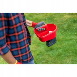 Pojemność prezentowanego siewnika to 3 l, a zasięg rozrzutu można regulować za pomocą wygodnych pokręteł w zakresie od 0,5 m do 2,5 m. Rozsiewacz ręczny zasilany jest czterema bateriami AA (paluszki) które nie znajdują się w zestawie. Jego budowa pozwala na wygodną pracę prawą jak i lewą ręka.